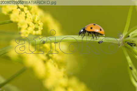 Titre : Coccinelle à 7 points et pucerons sur fleur de panais